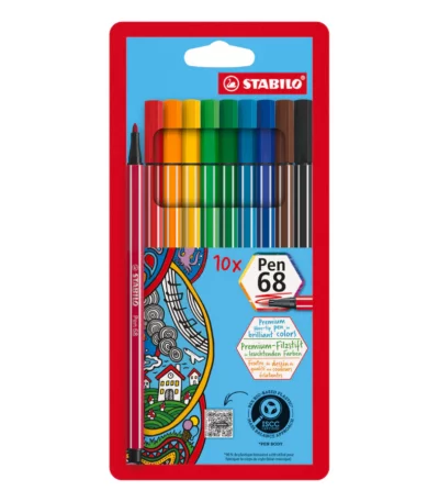 STABILO Pen 68 en étui carton de 10 feutres de dessin pointe moyenne. Retrouvez le détail des 10 couleurs dans la rubrique caractéristiques.