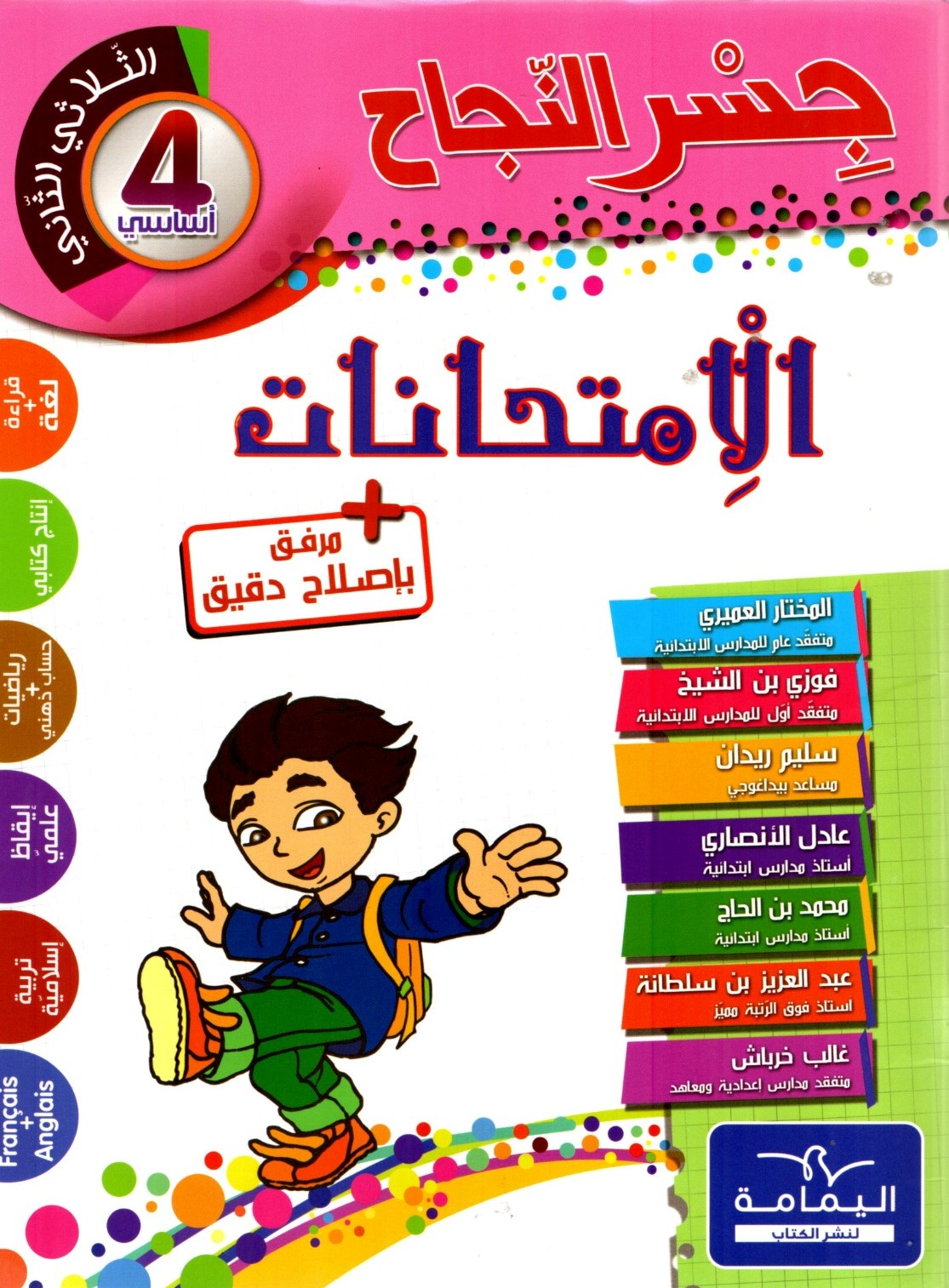 كتاب تعليمي خاص بتلاميذ السنةالرابعة من التعليم الأساسي، بعنوان « جسر النجاح – الامتحانات » خاص بالثلاثي الثاني. يتضمن مراجعة شاملة في مواد القراءة، القواعد، الإنتاج الكتابي، الحساب والقياس، الإيقاظ العلمي، والتربية الإسلامية، مع ملحق إصلاح دقيق.