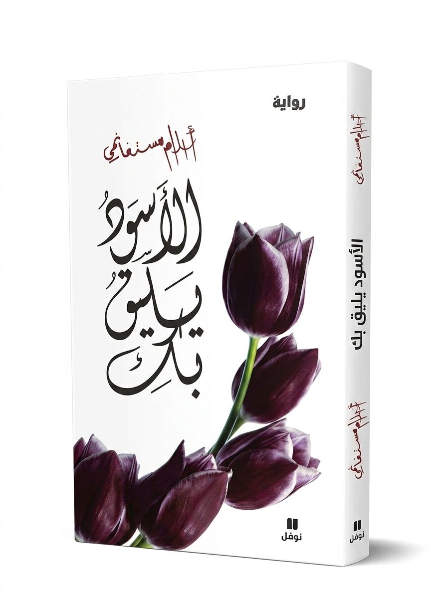 النص البديل : غلاف رواية « الأسود يليق بك » للكاتبة أحلام مستغانمي. يظهر على الغلاف الأبيض زهور توليب باللون الأرجواني الداكن (المائل للأسود) مع خط عربي فني أنيق باللون الأسود، وشعار دار نوفل في الأسفل.