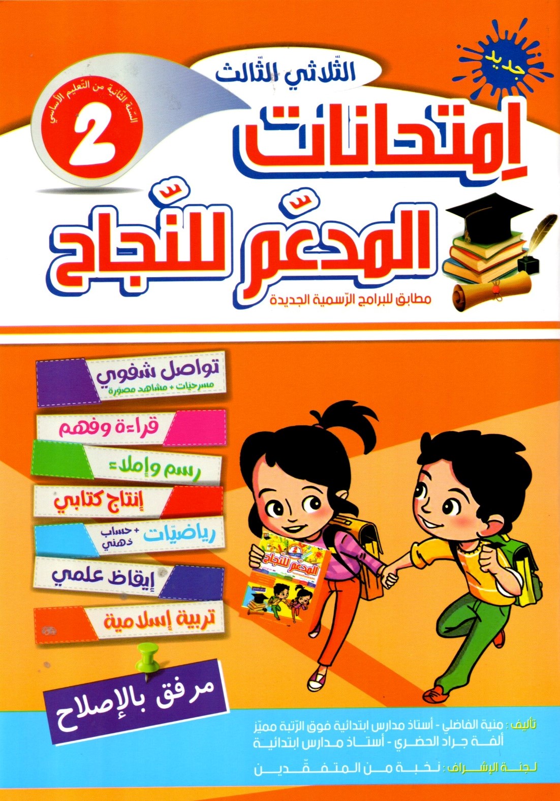 كتاب تعليمي تونسي بعنوان « امتحانات المدعم للنجاح » للسنة 2 من التعليم الأساسي، الثلاثي الثالث. يتميز التصميم بخلفية زرقاء ورسوم كرتونية لطفل وطفلة يحملان محافظهما، مع قائمة ملونة للمواد الدراسية وشارة « جديد ».