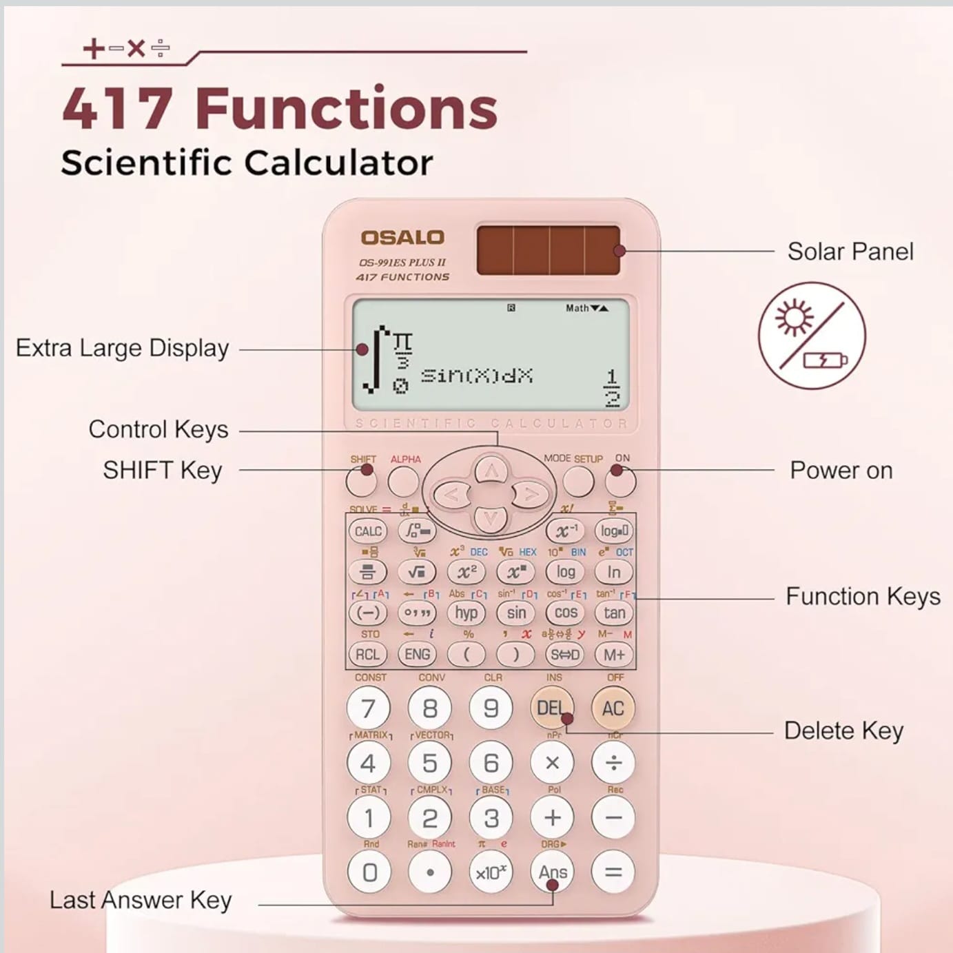 【Calculatrice scientifique 417 fonctions】 Avec ses 417 fonctions couvrant les fractions, les exposants, les calculs matriciels, les statistiques, les intégrales, l’algèbre, les nombres complexes, l’écart type, la résolution de variables, les permutations, les combinaisons et la régression linéaire, cette calculatrice scientifique englobe la majorité des besoins des élèves, du collège jusqu’à l’université, tant pour les cours que pour les examens. La notice d’instructions jointe vous aidera à maîtriser et à localiser chacune de ces fonctions.