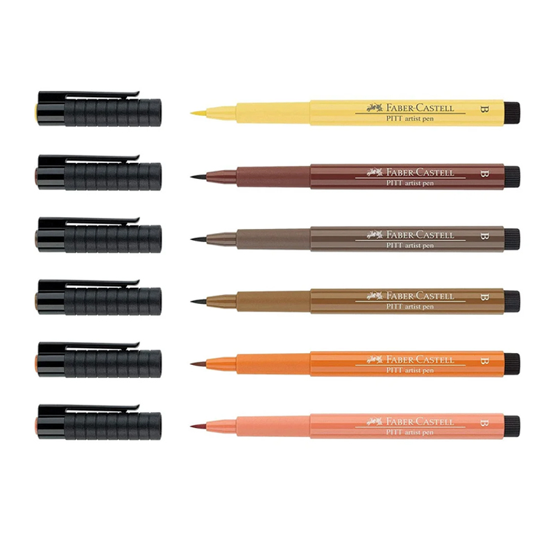 Ce set de 6 couleurs se concentre sur les teintes terre. D’ailleurs, ces nuances sont parfaites pour la nature et le portrait. La pointe pinceau vous permet de colorier de grandes surfaces. Par conséquent, vous réalisez des effets de lavis. Vous utilisez la pointe fine pour les détails.