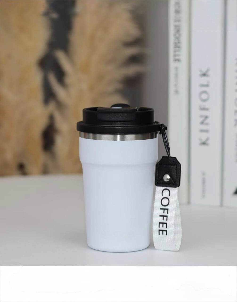 * Design Bicolore Premium : Le corps du mug arbore un fini blanc mat givré (anti-traces de doigts), créant un contraste élégant avec le couvercle et les finitions en similicuir noir.