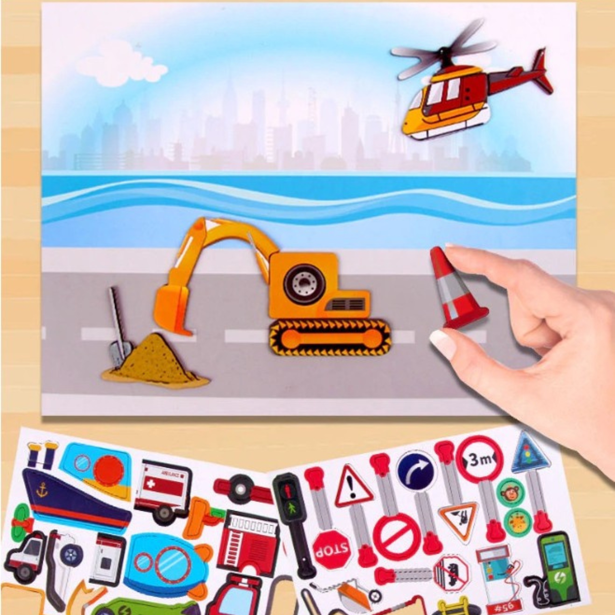 Nous savons que les parents en Tunisie recherchent des jeux qui combinent sécurité et apprentissage. Ainsi, ce puzzle magnétique est conçu pour une « croissance saine » de l’enfant. Les pièces sont faciles à manipuler et adhèrent parfaitement à la surface de jeu. Le jeu encourage l’enfant à reconstituer des véhicules (camion de pompiers, excavatrice, hélicoptère) et à placer des panneaux de signalisation et des accessoires de construction (cônes, pelle, tas de sable).